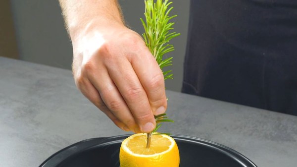 - Plantez maintenant 3 branches de romarin au milieu du citron coupé.