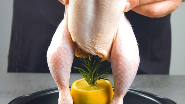 - Lavez le poulet à l'eau froide, essuyez-le avec du papier absorbant et placez-le soigneusement sur le citron de manière à ce qu'il se tienne debout avec les brins de romarin à l'intérieur.