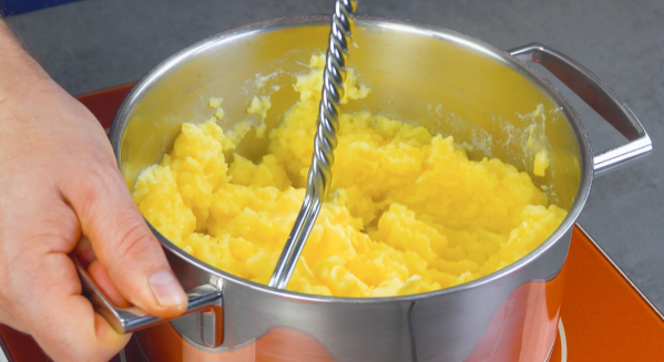 • Épluchez les pommes de terre et faites-les bouillir dans de l'eau salée jusqu'à ce qu'elles soient tendres puis égouttez-les. Ajoutez le lait chaud et le beurre et réduisez le tout en purée à l'aide d'un presse-purée. Enfin, assaisonnez la purée de pommes de terre avec de la noix de muscade.