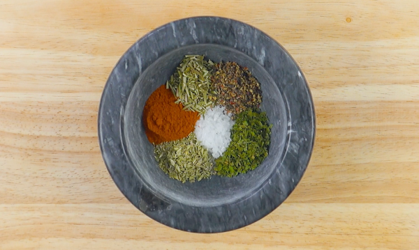 • Mettez le thym, le romarin, le basilic, le paprika, le sel et le poivre dans un mortier, pilez les épices et mélangez-les.