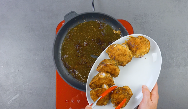 • Faites frire les hauts de cuisse dans l'huile d'olive jusqu'à ce qu'ils soient dorés des deux côtés. Retirez ensuite la viande de la poêle et réservez-la, pour le moment.