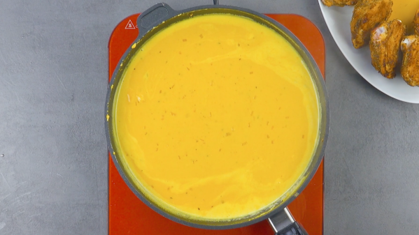 • Faites fondre le beurre dans la poêle pendant qu'elle est encore chaude et faites-y revenir les oignons et l'ail. Ajoutez la farine, faites-la brièvement puis déglacez le tout avec le bouillon de poulet et la crème. Portez la sauce à ébullition, en remuant constamment, puis laissez mijoter pendant environ 10 minutes.