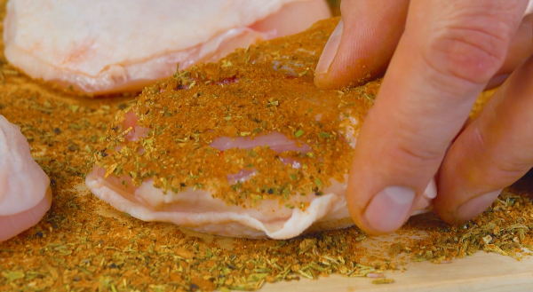 • Frottez les cuisses de poulet des deux côtés avec le mélange d'épices.