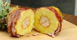 • Enveloppez votre ananas garni et assaisonné dans des tranches de lard en les faisant tenir avec des cure-dents. Badigeonnez votre enveloppe de sauce barbecue.