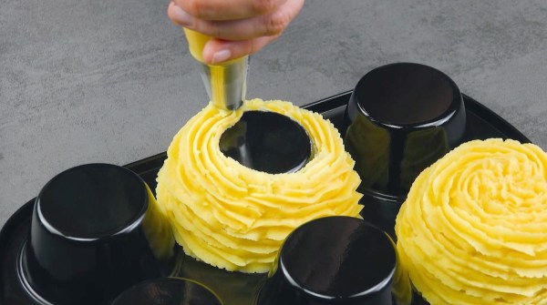 - Retournez un moule à muffins et graissez-le. Injectez maintenant la purée de pommes de terre mélangée à la pâte à choux autour de trois moules à muffins de manière à former de petites tours. Placez ensuite le tout dans le congélateur pendant environ 1 heure et demie.