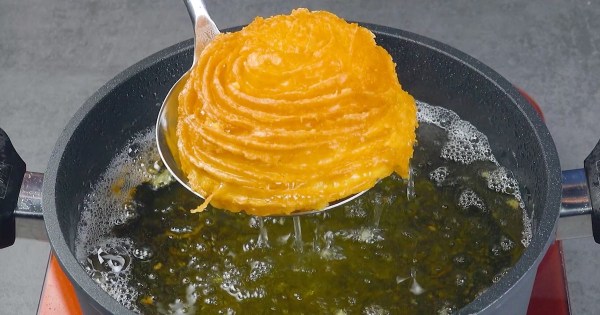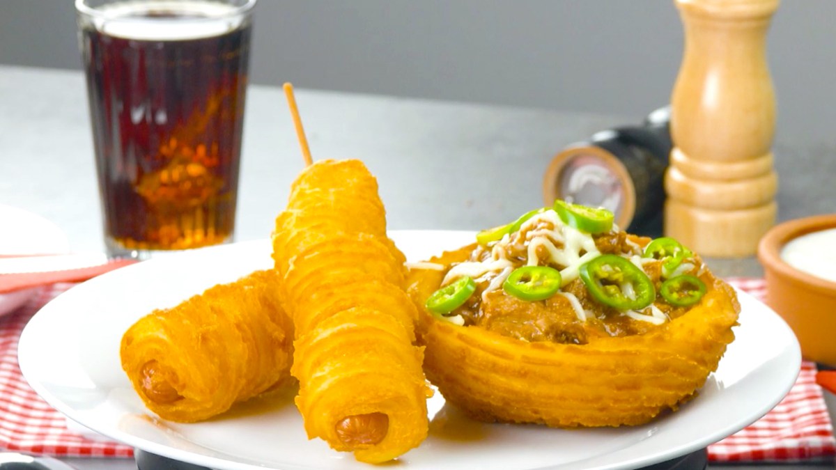 - Enfilez les saucisses sur des brochettes en bois et enduisez-les également de pâte à choux aux pommes de terre. Faites frire les saucisses enrobées de purée de pommes de terre pendant 2-3 minutes jusqu'à ce qu'elles soient dorées.
