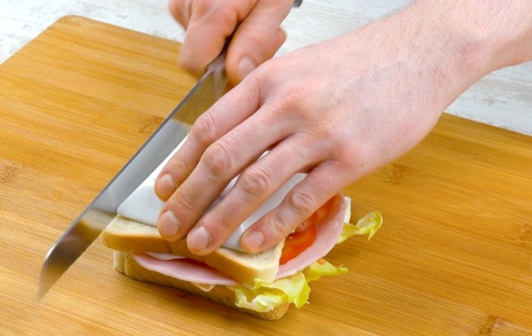 - Recouvrez 10 toasts de salade, d'une tranche de cheddar, d'une tranche de jambon cuit et de quelques tranches de tomates. Posez ensuite sur chaque toast un autre toast tartiné de fromage frais, de manière à former des sandwichs. Découpez ensuite les bords de ces sandwichs afin d'obtenir des carrés bien ordonnés et de même taille.