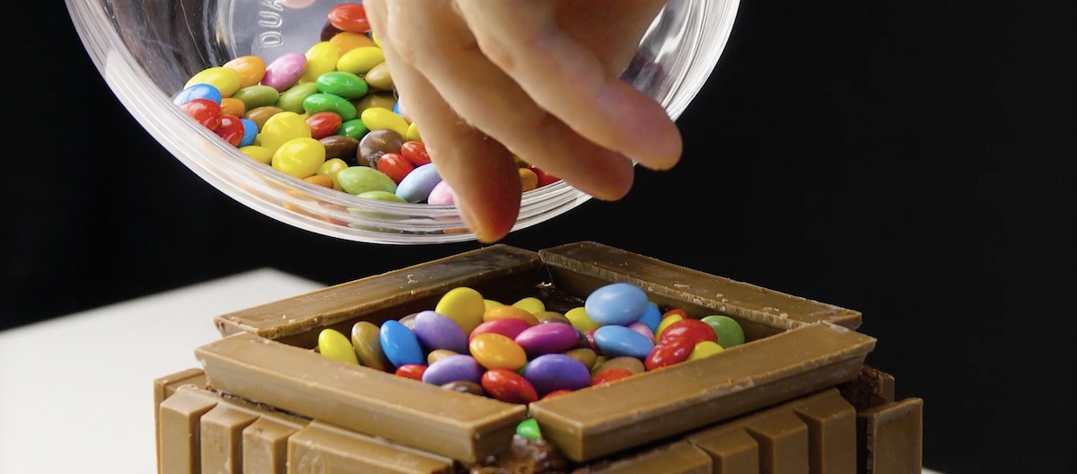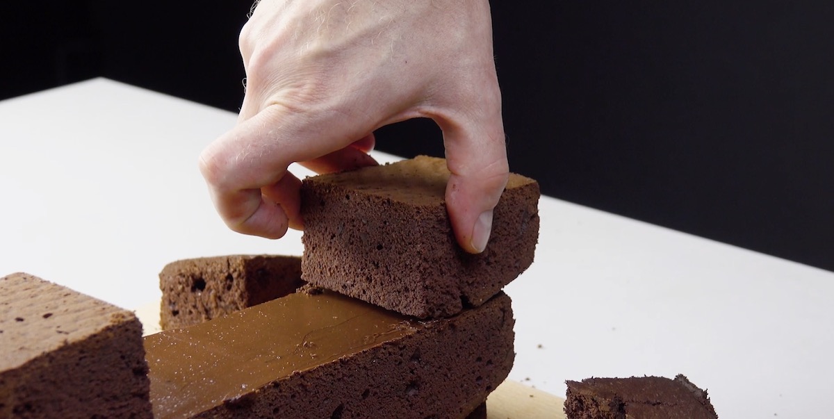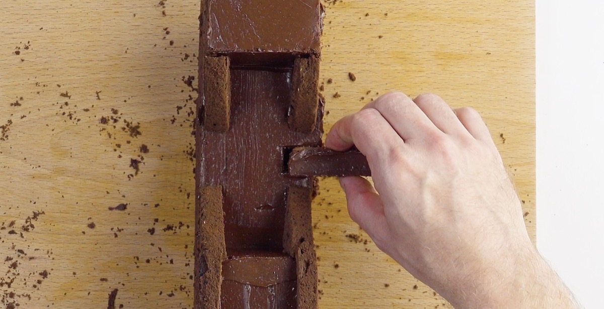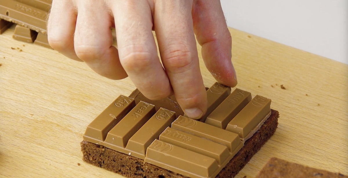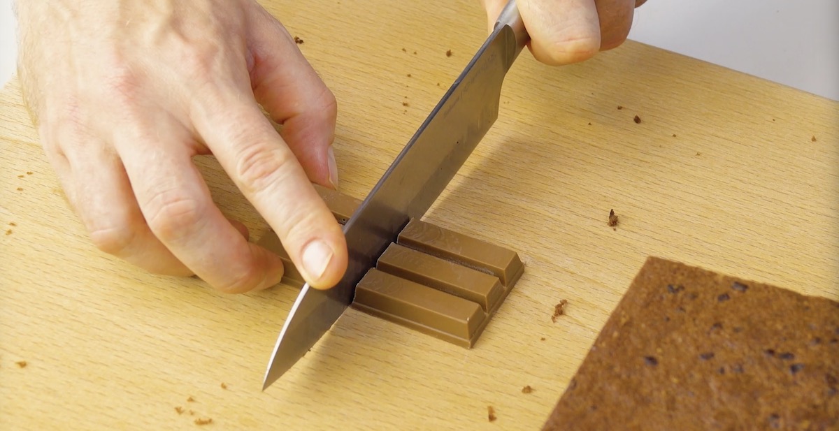 3) Prenez un bloc KitKat, coupez une barre et coupez le reste du bloc en deux.