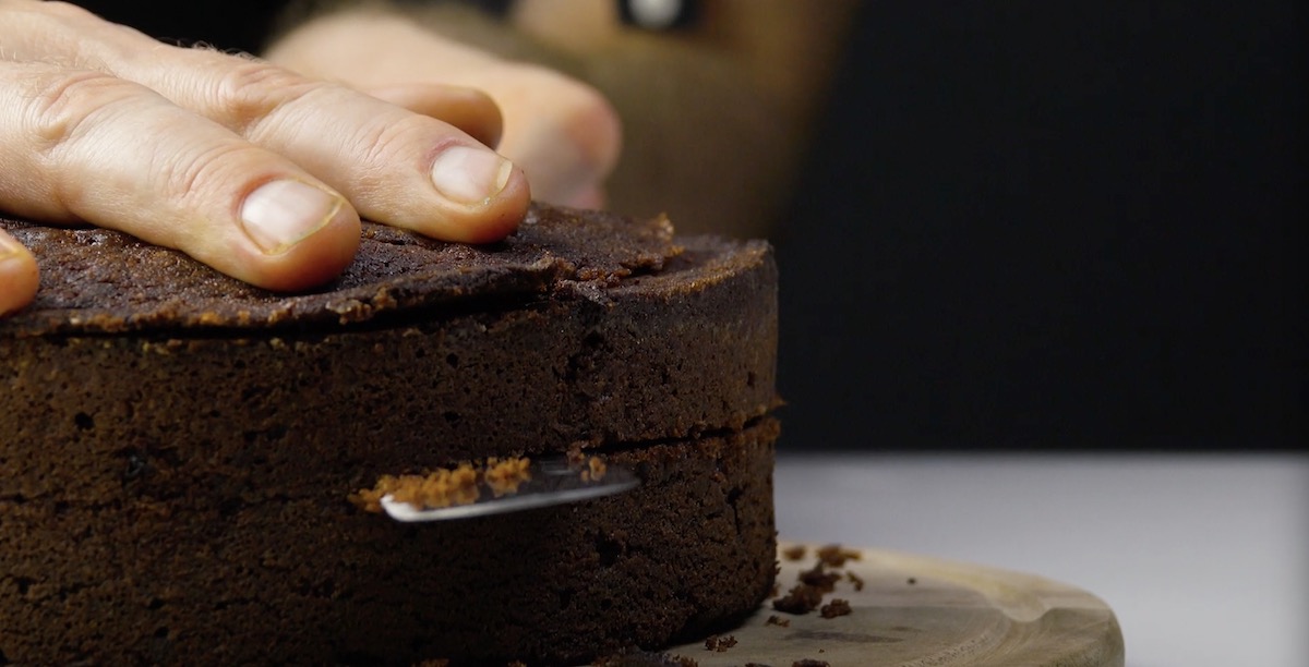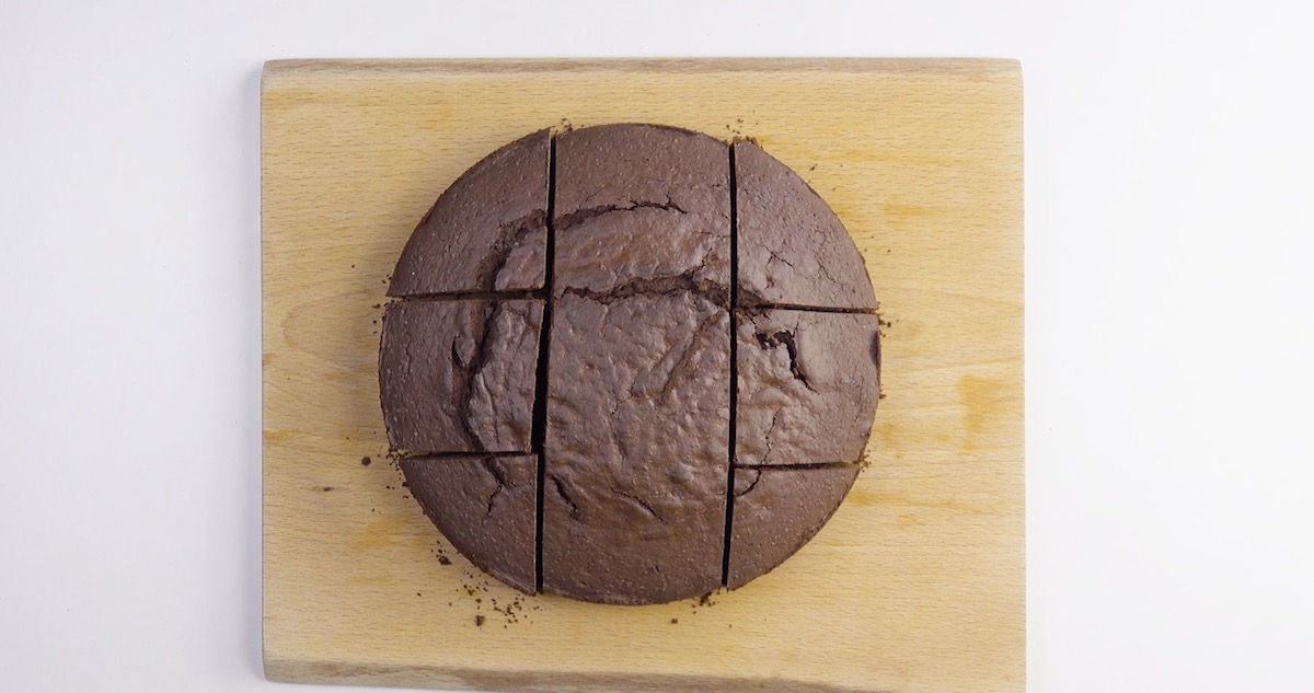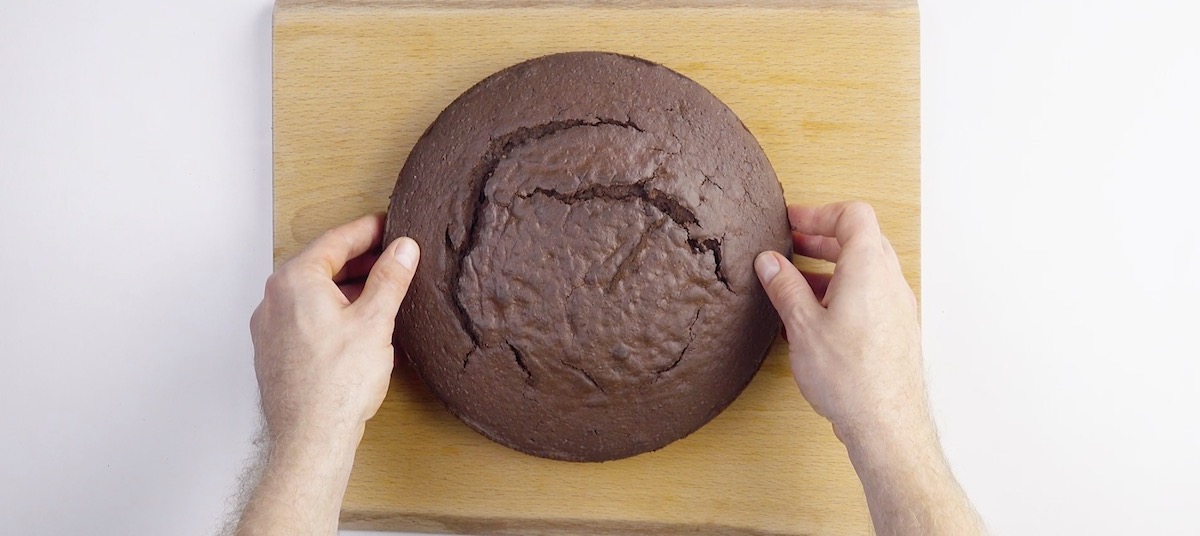 2) Coupez maintenant le “couvercle” du gâteau puis divisez le gâteau en deux moitiés.