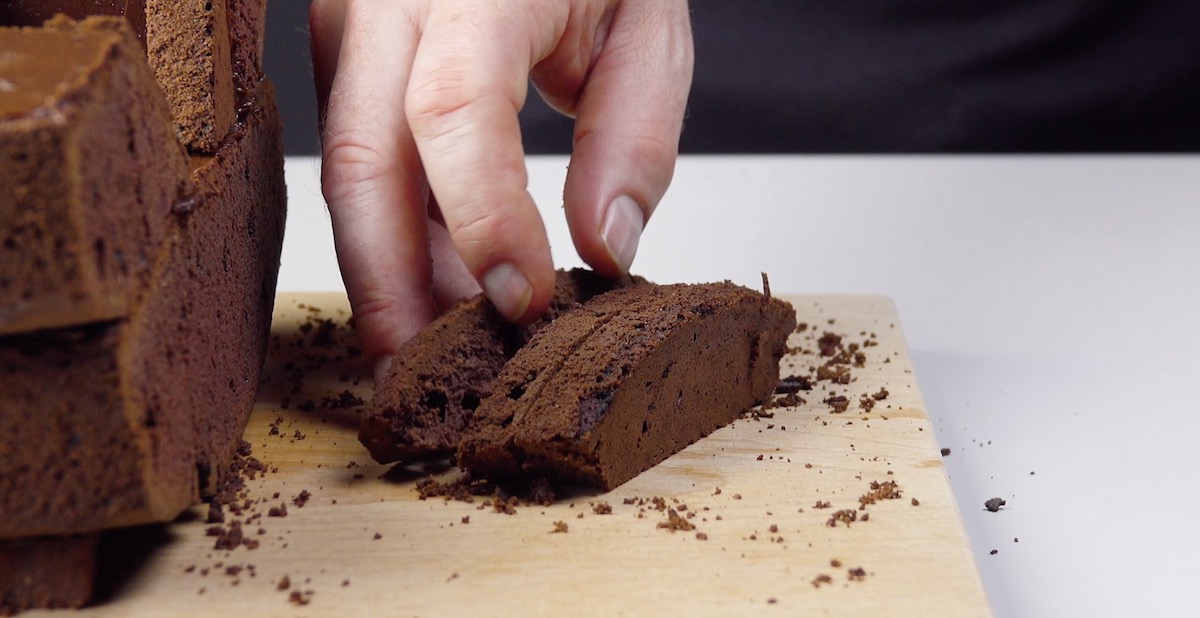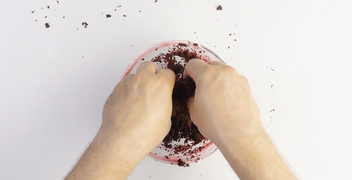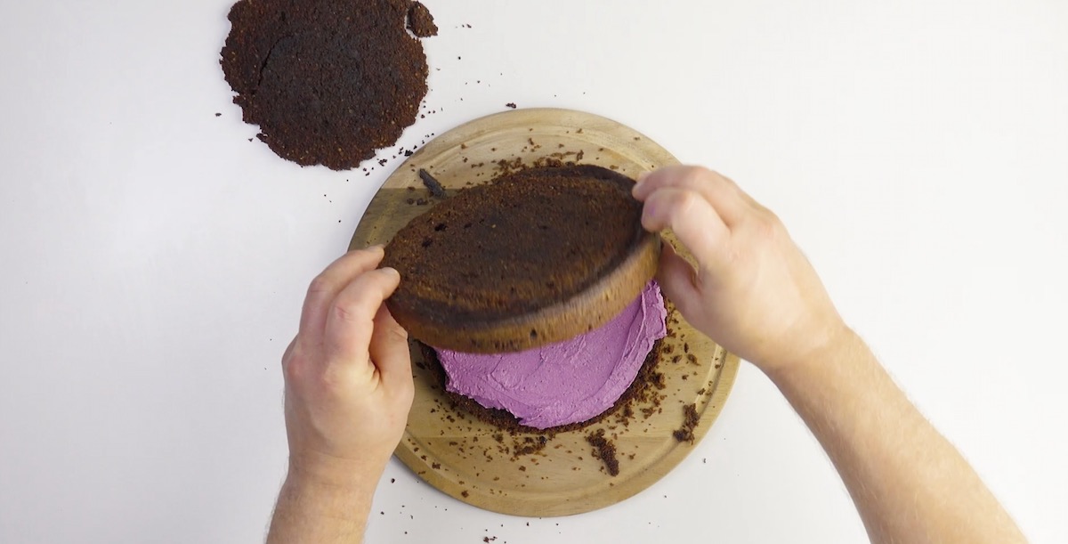 5) Émiettez le “couvercle du gâteau” dans le reste de la crème au beurre et formez une boule.