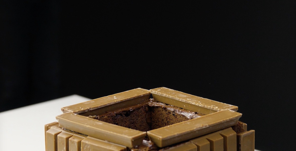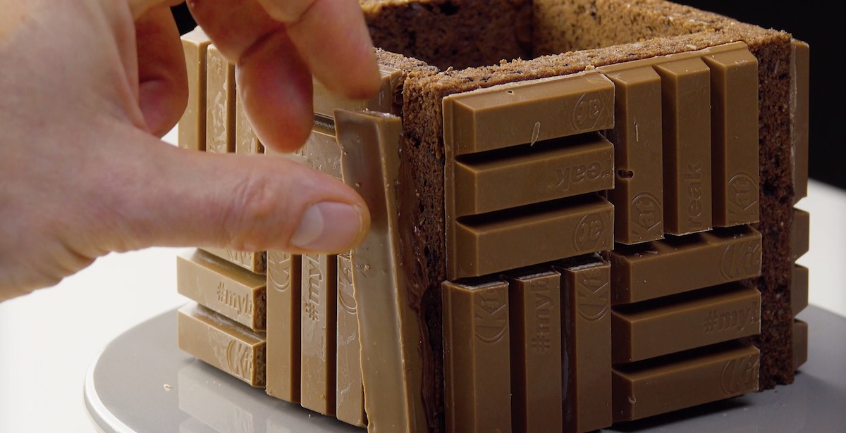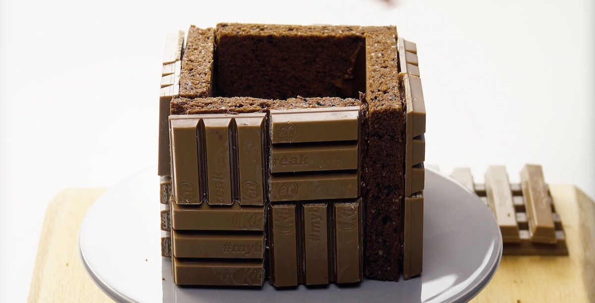 4) Préparez la crème au beurre au chocolat en mélangeant les ingrédients ensemble. Étalez-en sur 5 carrés de gâteau (sur le dessus) et placez deux blocs de KitKat coupés sur mesure.