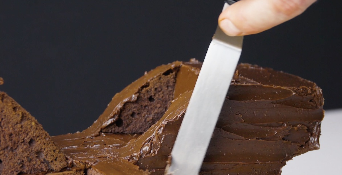 3) Mettez le rectangle à l’envers de façon à ce qu’il soit courbé vers le bas et enduisez-le de crème au beurre au chocolat.