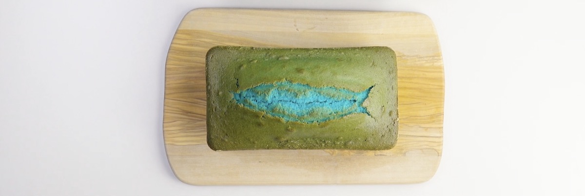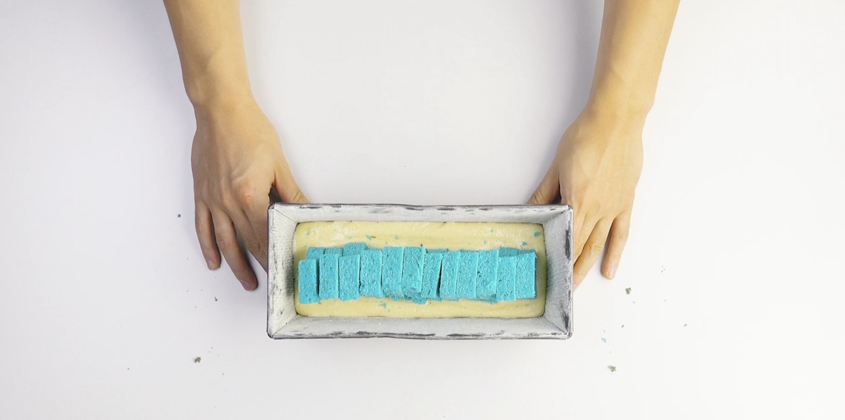 1) Tout d’abord, il faut faire cuire le gâteau bleu : mélangez tous les ingrédients jusqu’à obtenir un mélange crémeux que vous colorez ensuite avec du colorant alimentaire. Versez-le dans un moule graissé puis enfournez le tout pendant 60 minutes à 180 °C à chaleur tournante. Laissez ensuite refroidir avant de démouler.