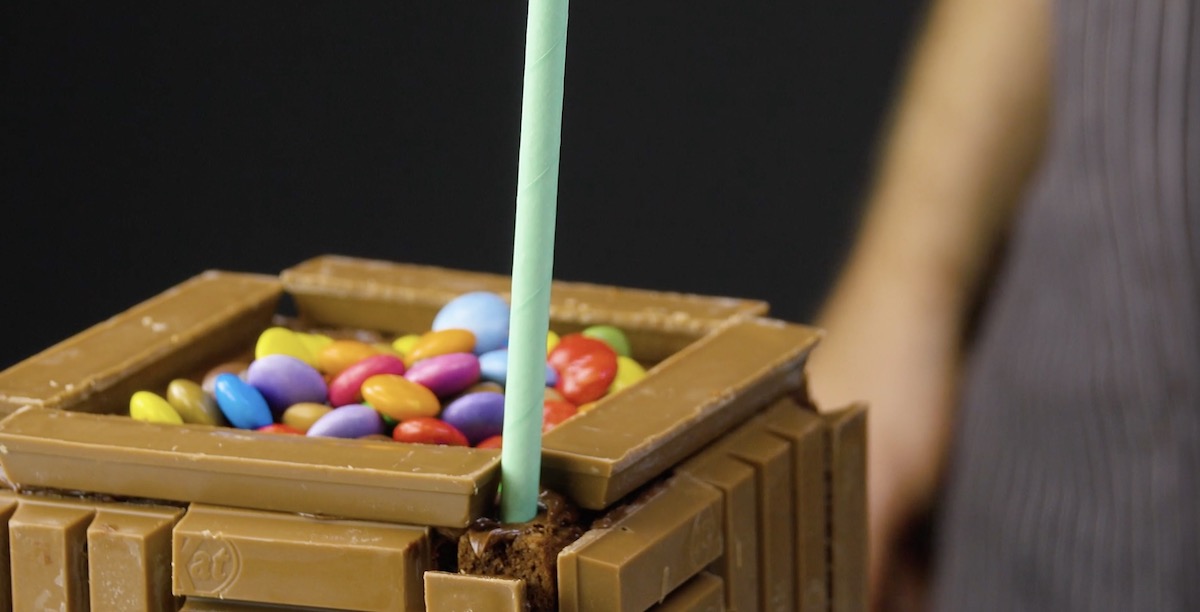 6) Maintenant, prenez les barres individuelles coupées des blocs de KitKat, badigeonnez-les de crème au beurre au chocolat sur le dessus et collez-les aux coins du panier où il reste de la pâte.