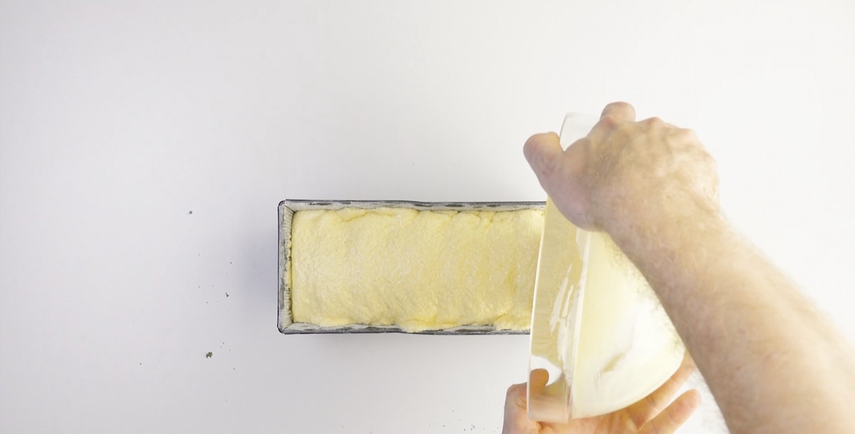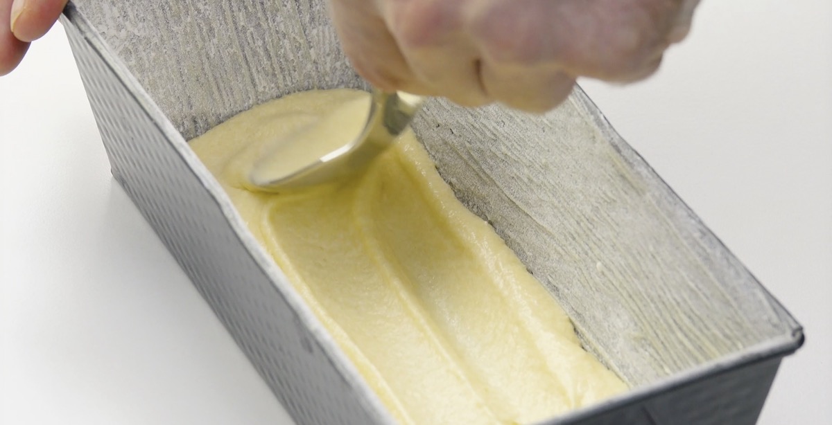 2) Préparez la pâte à gâteau neutre en mélangeant tous les ingrédients. Versez trois cuillères à soupe de ce mélange dans un moule beurré et farinée et lissez le mélange.