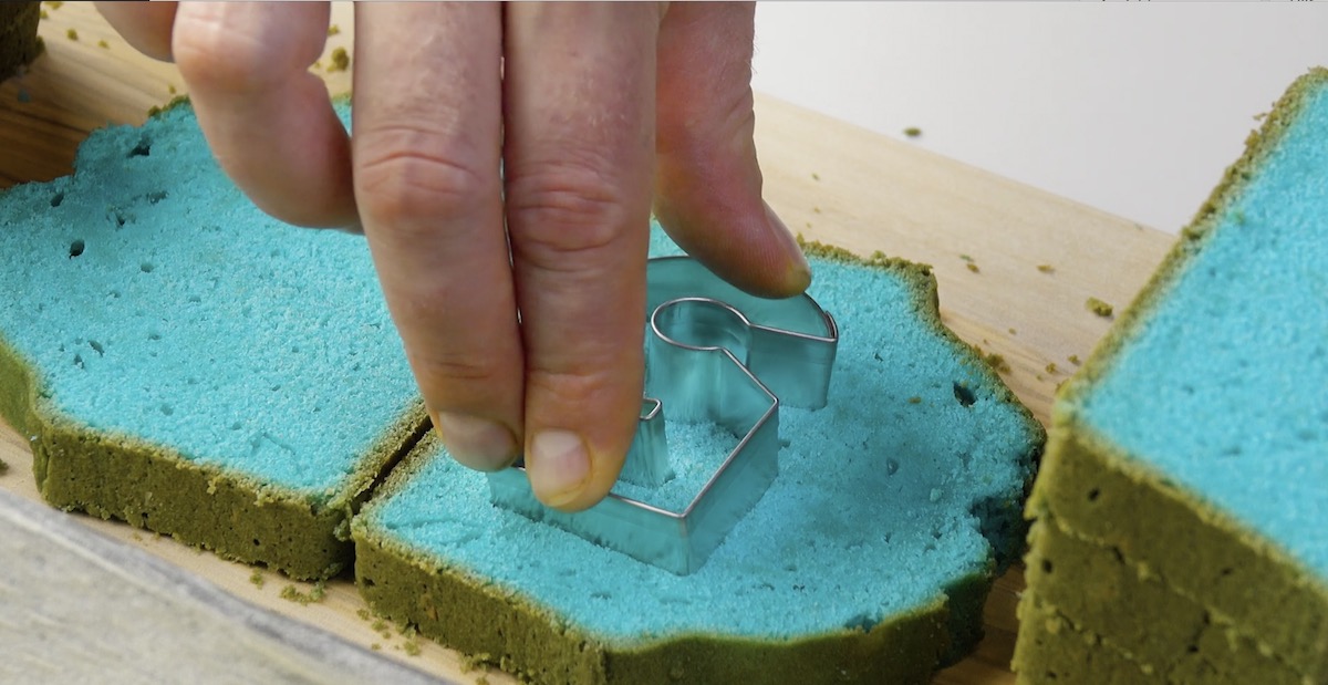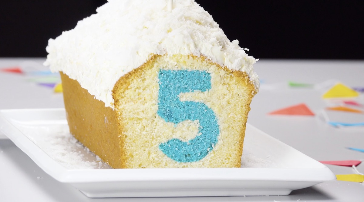 3) Coupez le gâteau bleu en tranches d’environ 1 cm d’épaisseur. Placez les bords à plat et utilisez un emporte-pièce chiffre pour découper le numéro. Le chiffre est choisi en fonction de l’âge de la personne à l’honneur, bien entendu.