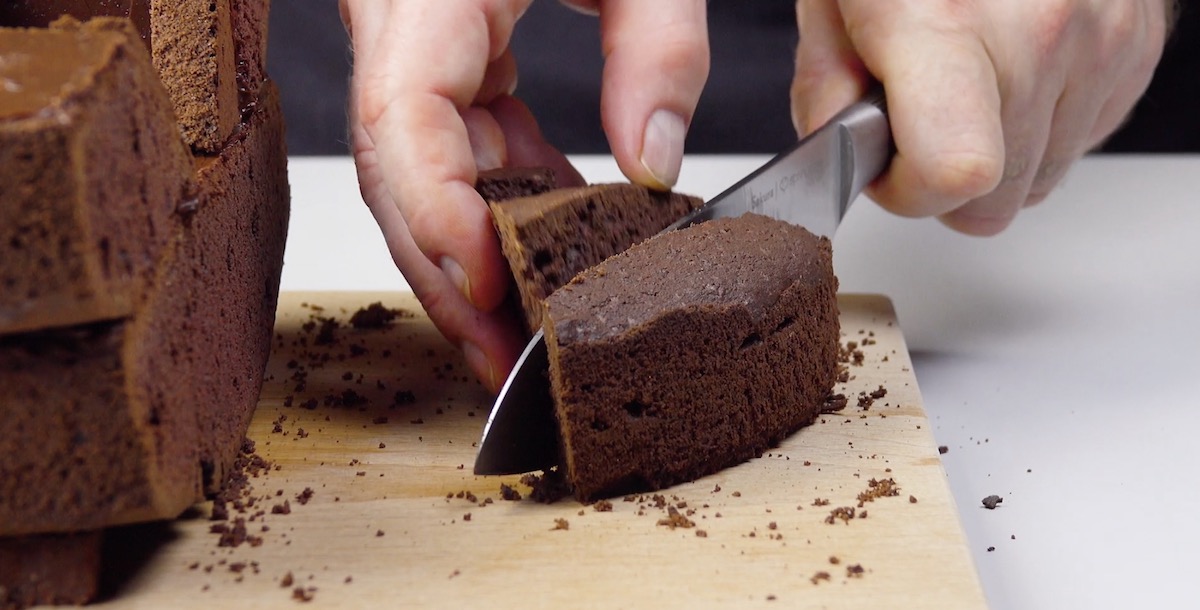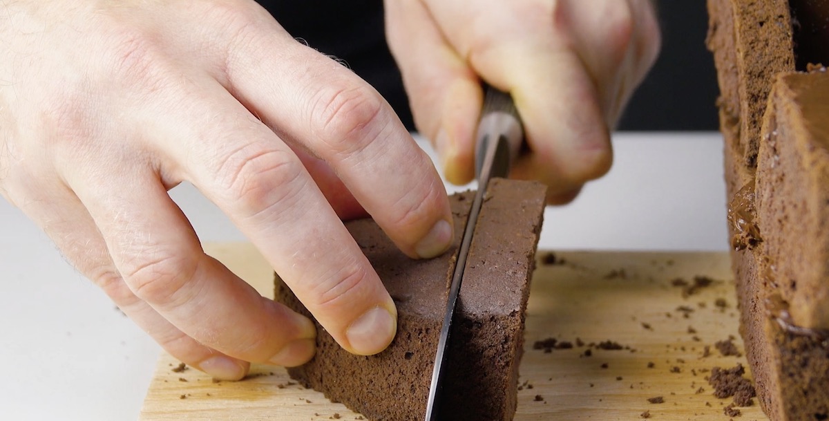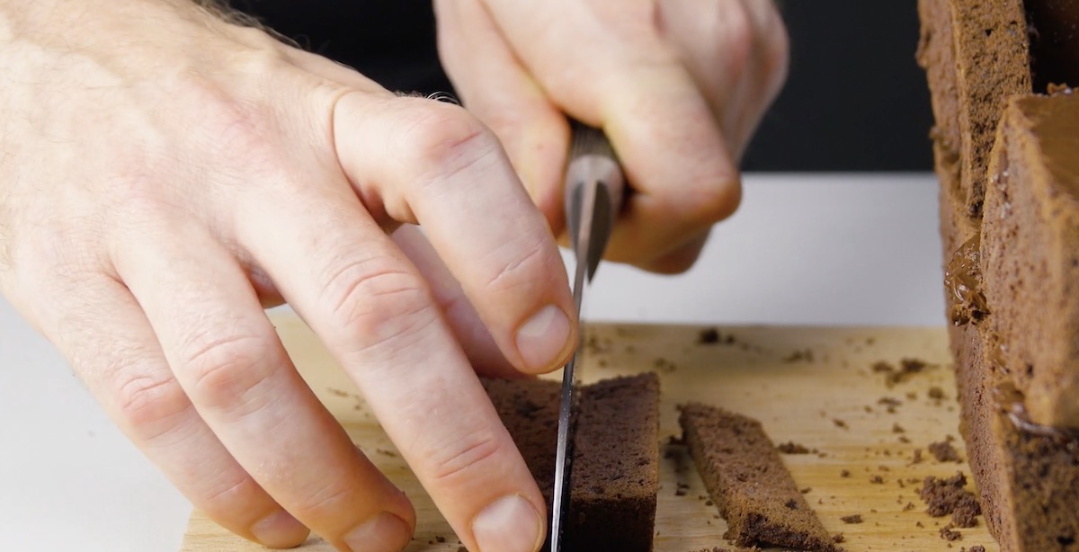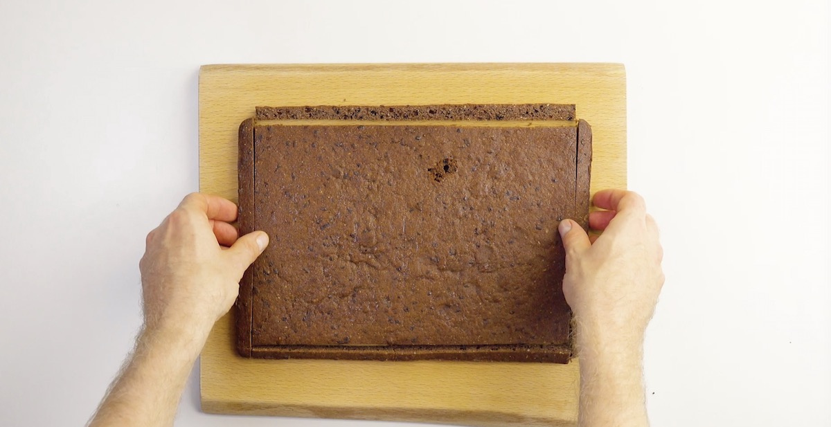 1) Mélangez tous les ingrédients pour le gâteau au chocolat et enfournez sur une plaque de cuisson (environ 35 x 20 cm) pendant 25 minutes à 180 °C à chaleur tournante. Laissez le gâteau refroidir complètement puis coupez les bords.