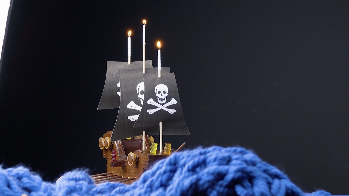 13) Enfin, décorez le bateau pirate avec des bonbons au caramel pour former les hublots et des bâtons de Mikado pour les rames. Des drapeaux et des bougies collés sur des brochettes de bois ainsi que des oursons en gélatine donnent la touche finale au gâteau “flottant”. Mettez le gâteau au réfrigérateur pendant au moins une heure avant de le manger.