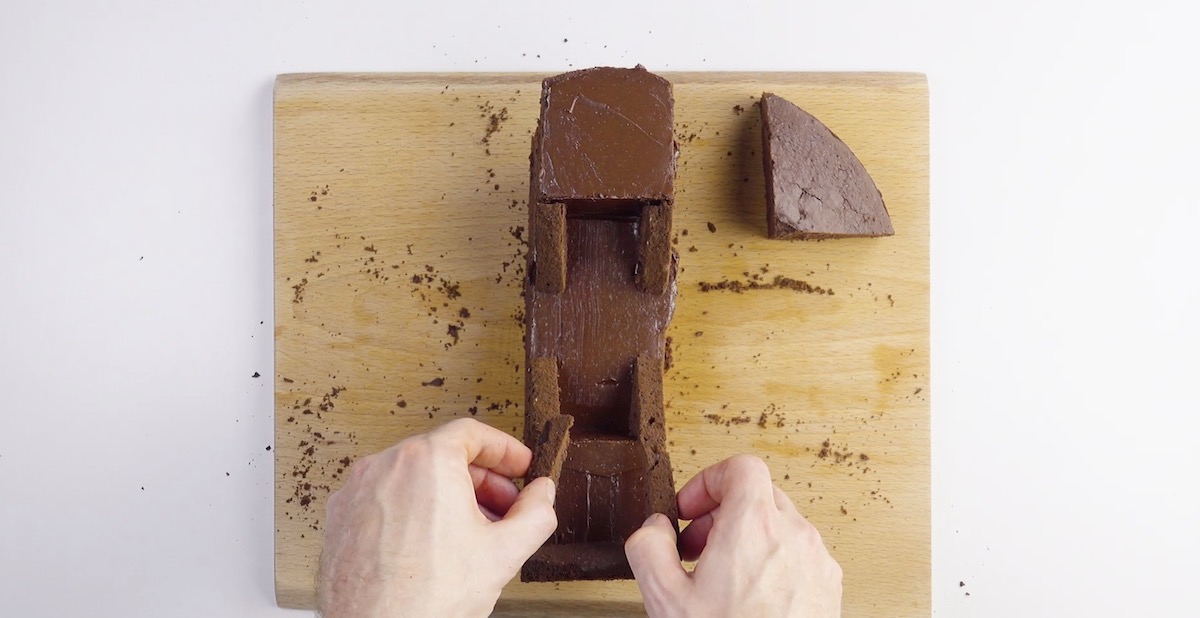 11) Étalez la crème au beurre au chocolat sur une partie du dessus. Découpez un petit carré dans le bateau et insérez le morceau de gâteau allongé, pour former une sorte de pont.