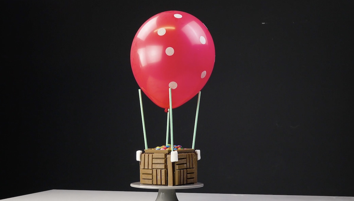 10) Enfin, décorez les coins avec des guimauves et placez un ballon entre les pailles. Le gâteau montgolfière est prêt.