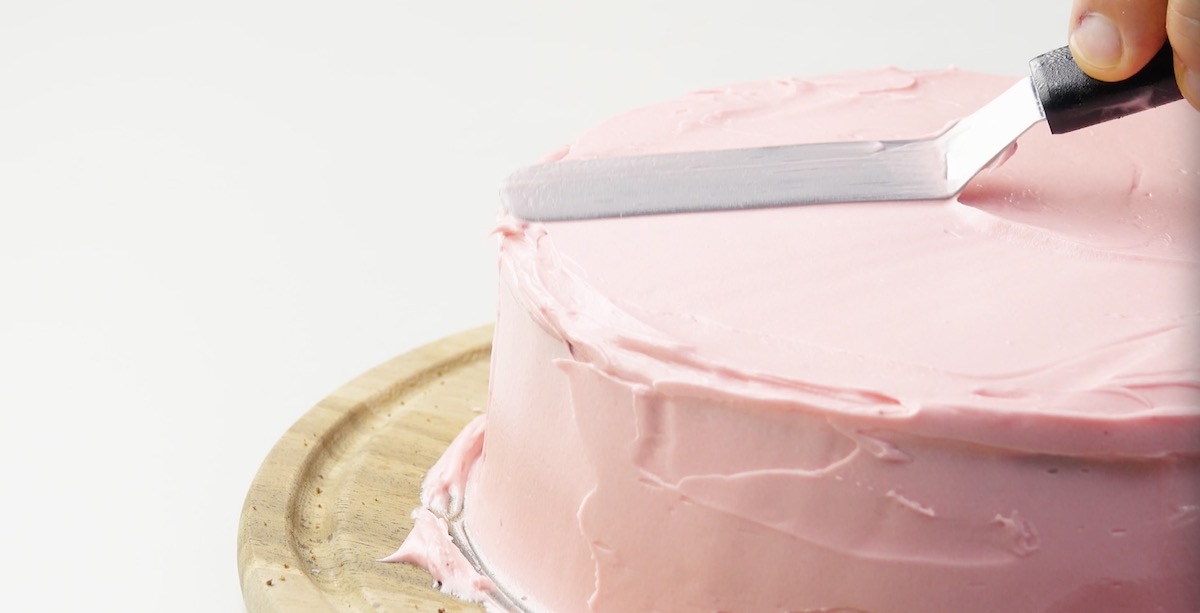 4) Incorporez le beurre et le sucre glace dans la crème au beurre et colorez-la avec le colorant alimentaire. Si vous le souhaitez, vous pouvez également la colorer avec de la confiture de myrtilles pour lui donner un goût fruité. Étalez la crème au beurre sur le gâteau et mettez-le au réfrigérateur pendant 1 heure.