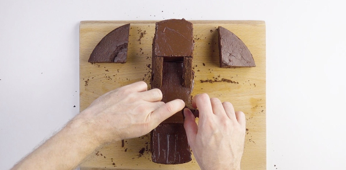 2) Au fur et à mesure que le gâteau refroidit, préparez la crème au beurre au chocolat. Il suffit de bien mélanger tous les ingrédients. Maintenant, le gâteau au chocolat refroidi doit être découpé pour construire le bateau pirate. Prenez un couteau et coupez le gâteau en six petits morceaux (quatre angles et deux carrés) et un grand rectangle, comme montré dans la vidéo.
