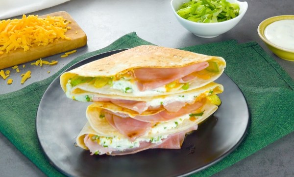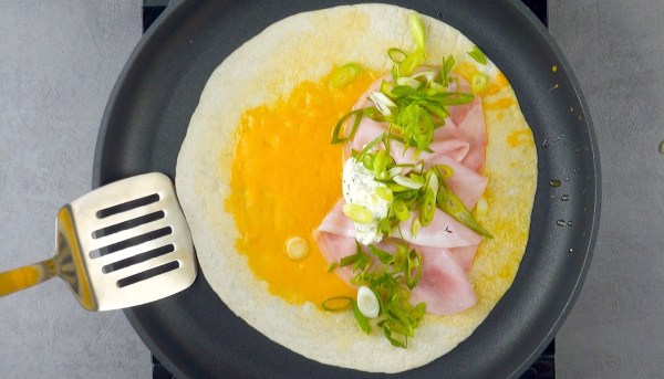 - Faites chauffer la poêle et faites-y fondre le cheddar. Posez ensuite la tortilla dessus, appuyez un peu dessus pour que le fromage y adhère et retournez le tout. Recouvrez ensuite une moitié de la tortilla de jambon, de crème aigre et d'oignons nouveaux.