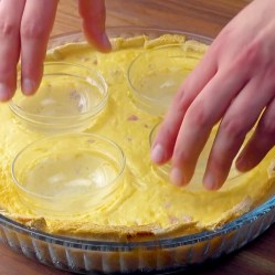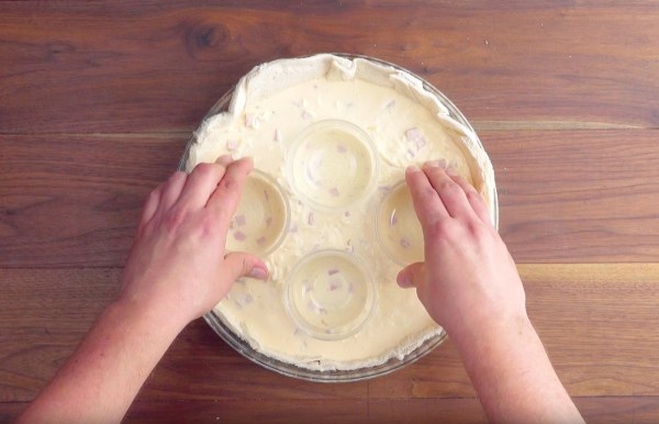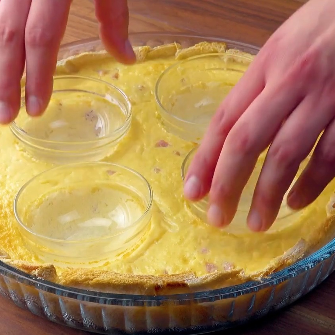 - Versez le mélange jambon-œuf-crème sur la pâte et pressez 4 petits ramequins en verre dans la pâte encore liquide. Enfournez à 160 °C pendant 25 minutes.