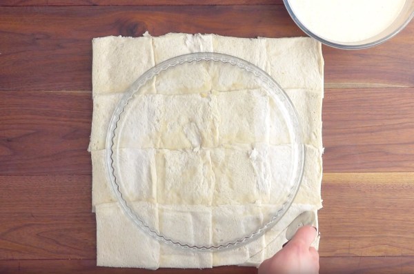- Posez le plat à quiche à l'envers sur le pain de mie, coupez le surplus de pâte et retournez le plat avec les toasts à l'intérieur. Pressez le tout fermement dans le fond et sur les bords du plat.