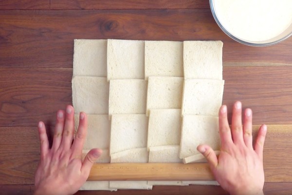 - Retirez la croûte des 16 tranches de pain de mie puis formez un carré avec. Ensuite, lissez le tout à l'aide d'un rouleau à pâtisserie.