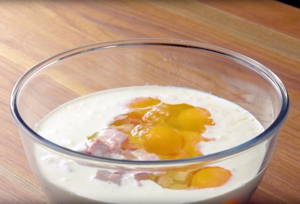 - Mettez la mozzarella râpée, les dés de jambon, la crème et les 5 œufs dans un saladier. Salez, poivrez et mélangez les ingrédients.