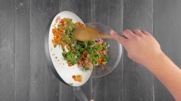 - Faites chauffer l'huile dans une poêle dans laquelle vous faites revenir l'oignon finement haché, les poivrons, le jambon et l'ail. Enfin, ajoutez les épinards. Versez le tout dans un saladier. Ajoutez à la garniture les œufs, le lait, le gruyère et le poivre, et mélangez bien. Versez le mélange dans le moule. Faites cuire le tout pendant 45 minutes à 160 °C, à chaleur tournante.