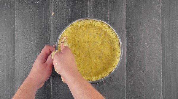 - Épluchez les pommes de terre. Placez un torchon propre dans un bol et râpez les pommes de terre dedans. Prenez le torchon avec les pommes de terre et pressez-les pour faire ressortir tout le liquide. Placez les pommes de terres râpées dans un saladier et mélangez-les avec les œufs, l'ail, les herbes de Provence, le sel et le poivre. Recouvrez un moule à charnière (environ 22 cm de diamètre) avec du papier sulfurisé. Versez le mélange dedans et pressez-le contre le fond et les rebords du moule. Faites cuire le tout 25 minutes à 180 °C, chaleur tournante.