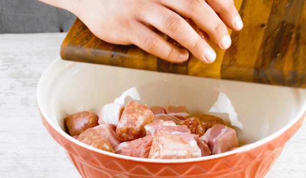- Coupez la poitrine de porc, le cou de porc et les salsiccia en petits morceaux et mettez-les dans un saladier. Mélangez tous les ingrédients pour le mélange d'épices et versez-le sur la viande. Mélangez le tout et mettez la viande, au réfrigérateur pendant 2 heures, à couvert.