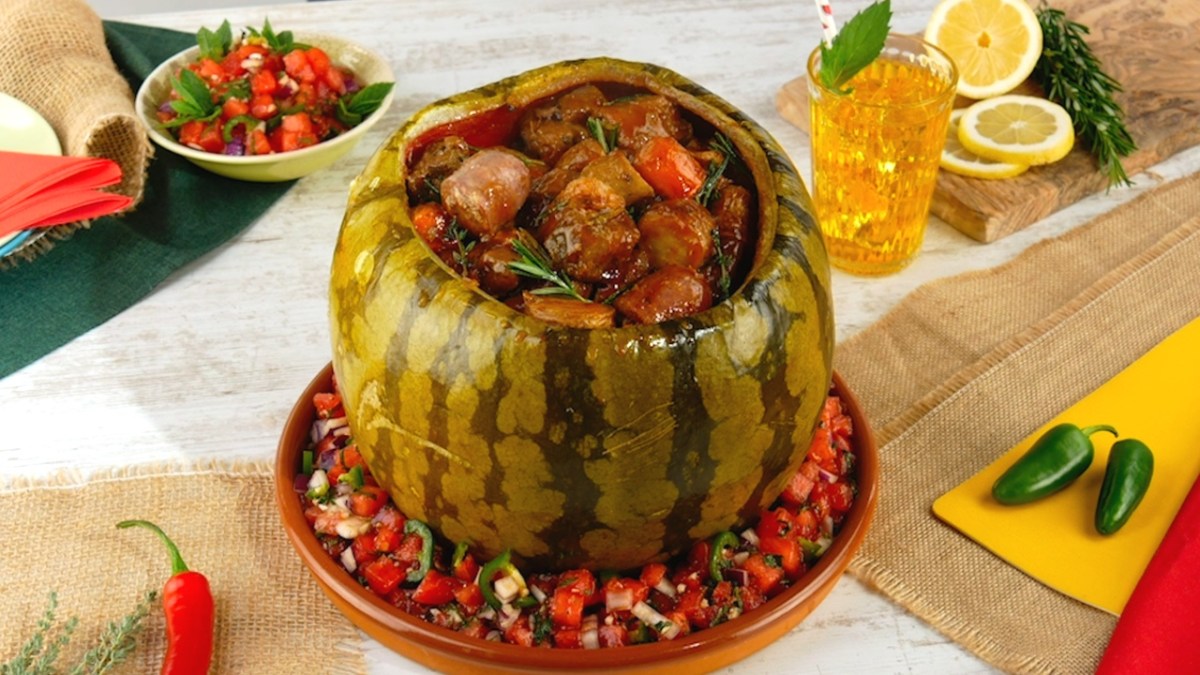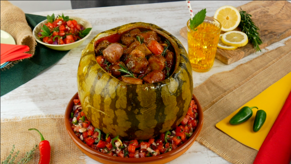 Il y a tellement de choses que l’on peut faire avec une pastèque : des boissons, des gourmandises, des gâteaux, nous avons une infinité de merveilleuses idées à réaliser avec cette bombe fruitée. Aujourd’hui, nous passons à un autre niveau, car nous préparons un ragoût de viande, directement cuit dans la pastèque. Il est accompagné de légumes et d’une salsa fruitée à la pastèque. Un pur délice quoi ! On vous montre :