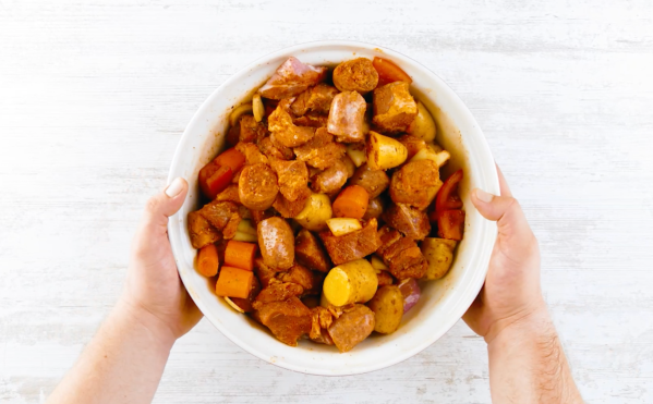- Coupez les légumes en petits morceaux, de la taille d'une noix, mélangez-les dans un saladier et ajoutez-les à la viande.