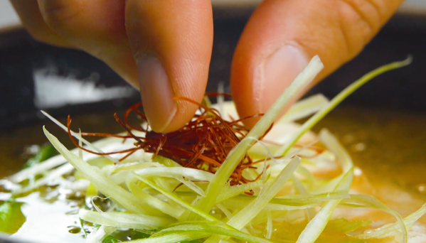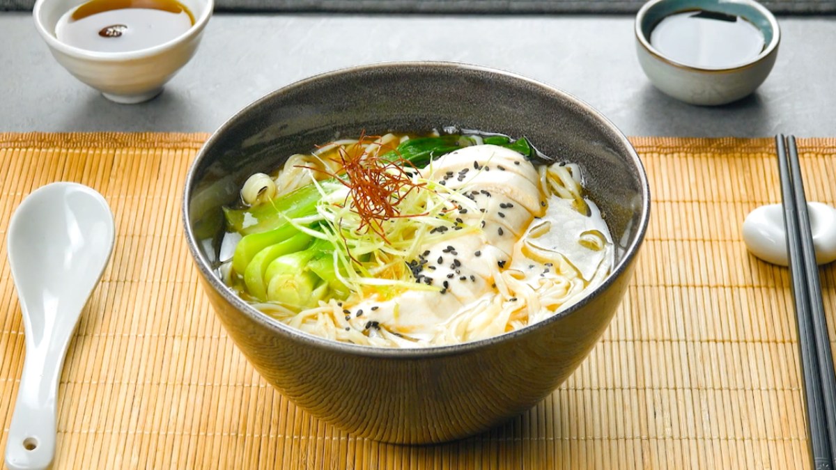 - Mettez l'huile de sésame dans un bol, ajoutez le bouillon de poule et salez le tout. Faites bouillir les nouilles dans de l'eau chaude pendant environ 1 minute. Ajoutez ensuite les nouilles à la soupe et mettez le poulet, le bok choy, les lamelles d'oignon nouveau et les fils de piment par-dessus.