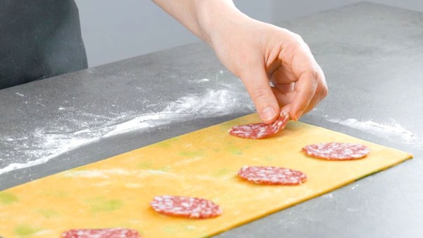 - Étalez les tranches de salami avec un peu d'espace entre elles sur la pâte.
