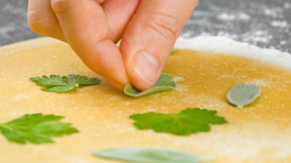 - Étalez la pâte en forme rectangulaire et déposez le persil et les feuilles de sauge sur la moitié inférieure de la pâte. Repliez la moitié supérieure par-dessus et étalez la pâte une fois de plus en fine couche jusqu'à ce que les herbes apparaissent légèrement à la surface.