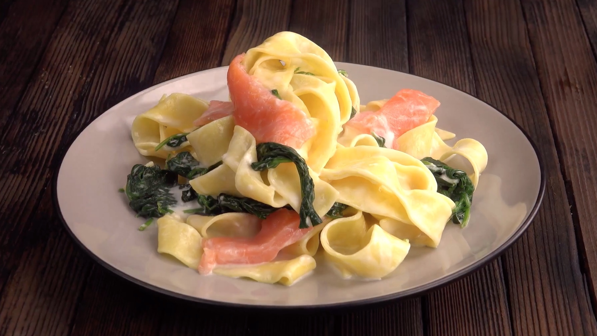 - Une fois que les pâtes sont cuites, ajoutez le saumon et chauffez brièvement.