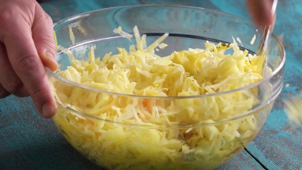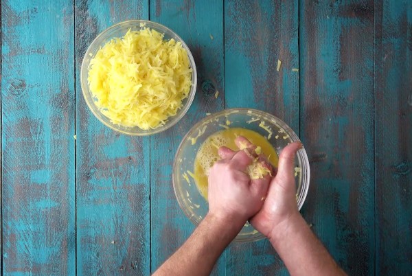 - Pelez les pommes de terre, râpez-les dans un saladier puis essorez-les en pressant des poignées de pommes de terre dans vos mains. Mettez-les dans un autre saladier.