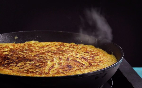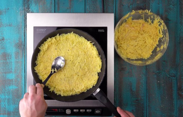 - Étalez le reste des pommes de terre par-dessus et laissez cuire. Aidez-vous de la seconde poêle pour retourner le rösti et faites cuire de l'autre côté.