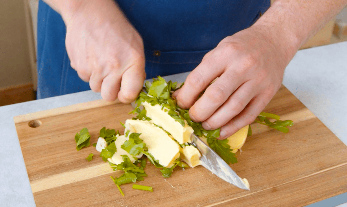 2.2 Hachez finement le beurre avec le basilic, l’ail et le persil pour créer un beurre aux herbes.