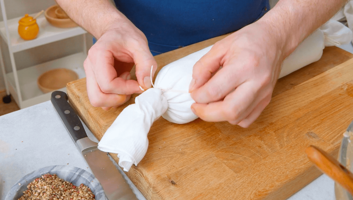 3.2 Ajoutez ensuite les œufs, le persil, le sel, le poivre et la muscade et mélangez bien. Étalez le tout au milieu d’un torchon en tissu, faites un rouleau et attachez les deux extrémités avec de la ficelle de cuisine. Placez un plat à gratin avec de l’eau bouillante dans le bas du four préchauffé à 140°C et posez le torchon garni sur une grille. Laissez les boulettes dans torchon cuire à la vapeur dans le four pendant environ 35 minutes.