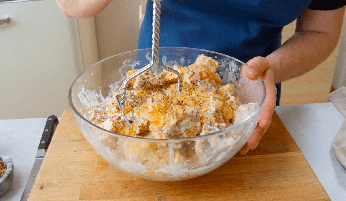 3.1 Coupez les restes de pain en petits morceaux. Faites revenir les oignons dans une poêle, versez dessus du lait puis mettez-les dans un bol avec les cubes de pain. Laissez infuser le mélange pendant environ 15 minutes et écrasez avec un presse-purée.