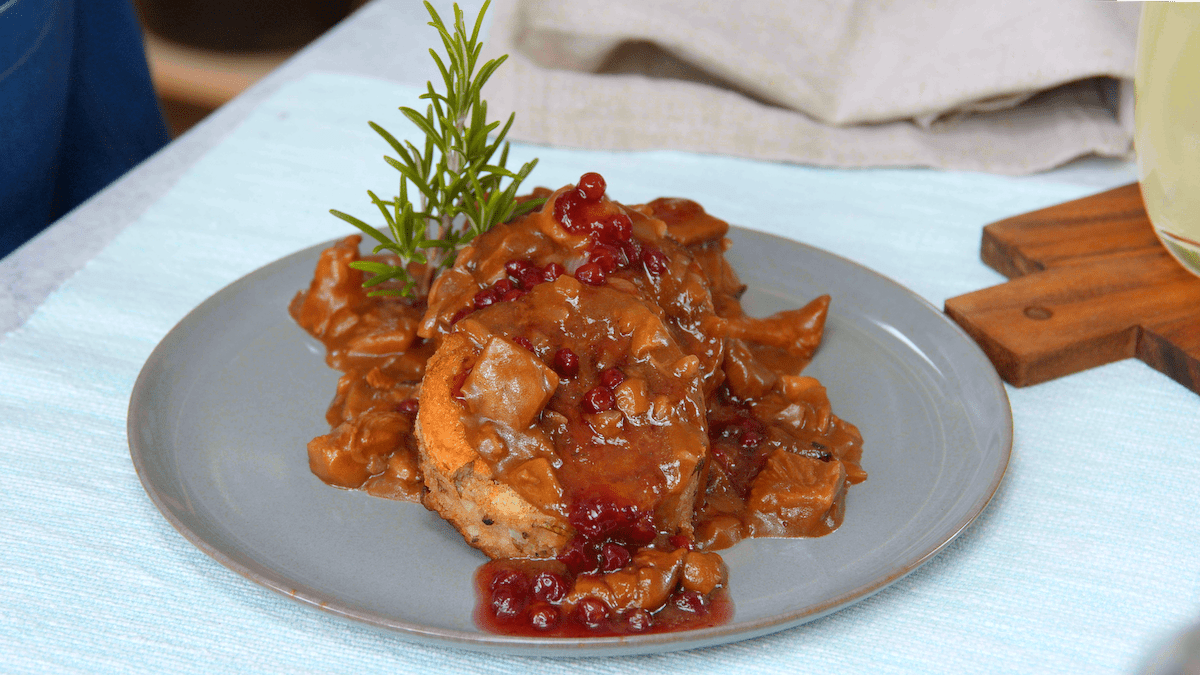 3.3 Roulez la boulette cuite hors du torchon et coupez-la en tranches. Faites frire les tranches dans une poêle jusqu’à ce qu’elles soient dorées et servez avec la sauce aux champignons, les canneberges et le romarin.