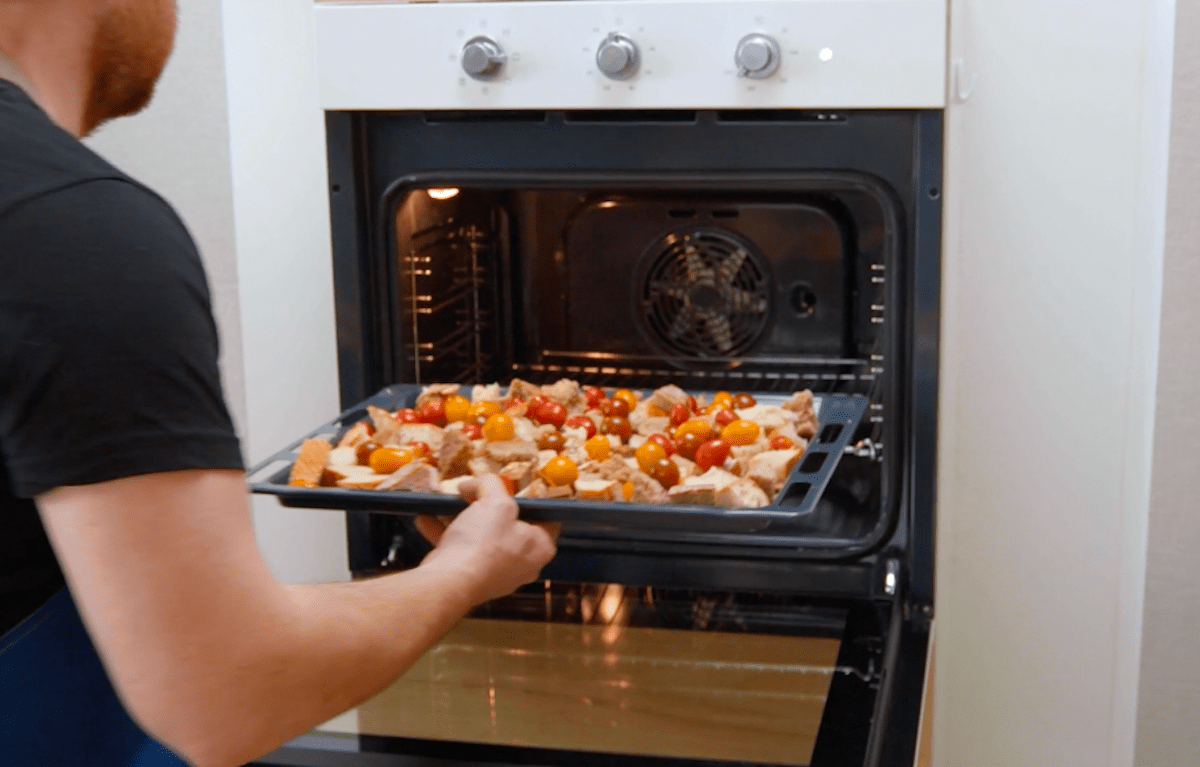2.1 Coupez les restes de pain en petits morceaux, placez-les sur une plaque avec les tomates cerises et enfournez à 180°C pendant 10 minutes.