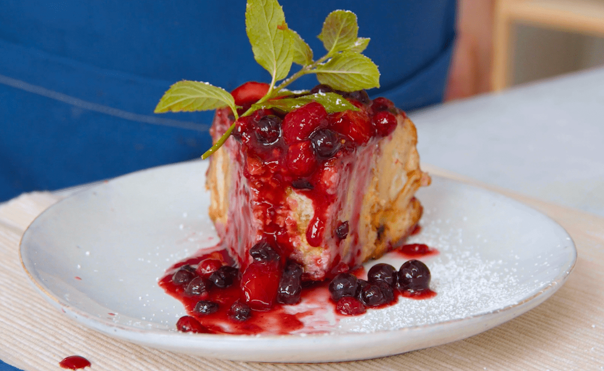 1.3 Après la cuisson, retournez la casserole de pain sucré sur une planche et saupoudrez-la de sucre en poudre. Garnissez également de compote de baies. Il est préférable de déguster le gâteau de pain pendant qu’il est encore chaud.