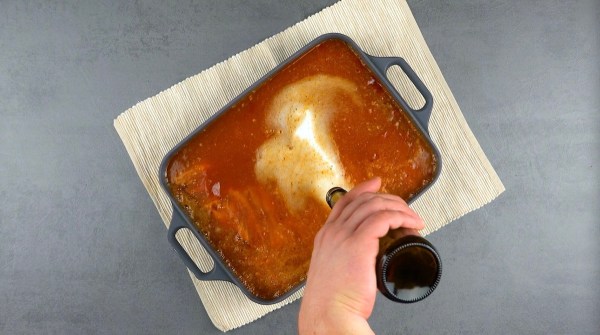 - Pour la sauce barbecue, mettez tous les ingrédients dans une casserole et faites cuire pendant 5 minutes. Étalez la sauce sur les ribs et versez une bouteille de bière par-dessus.