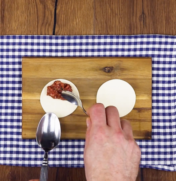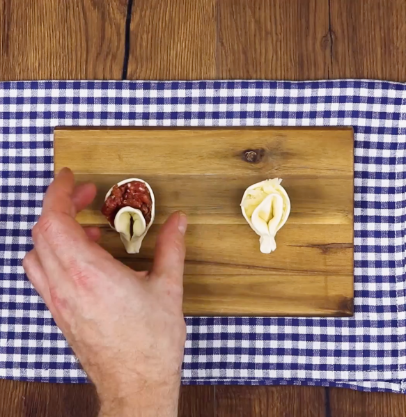 • Prenez les cercles de pâte, pliez-les en leur milieu et pressez les côtés ensemble de façon à ce que la viande ou le fromage ne puisse pas s'échapper. Les morceaux doivent ressembler à des tortellini.